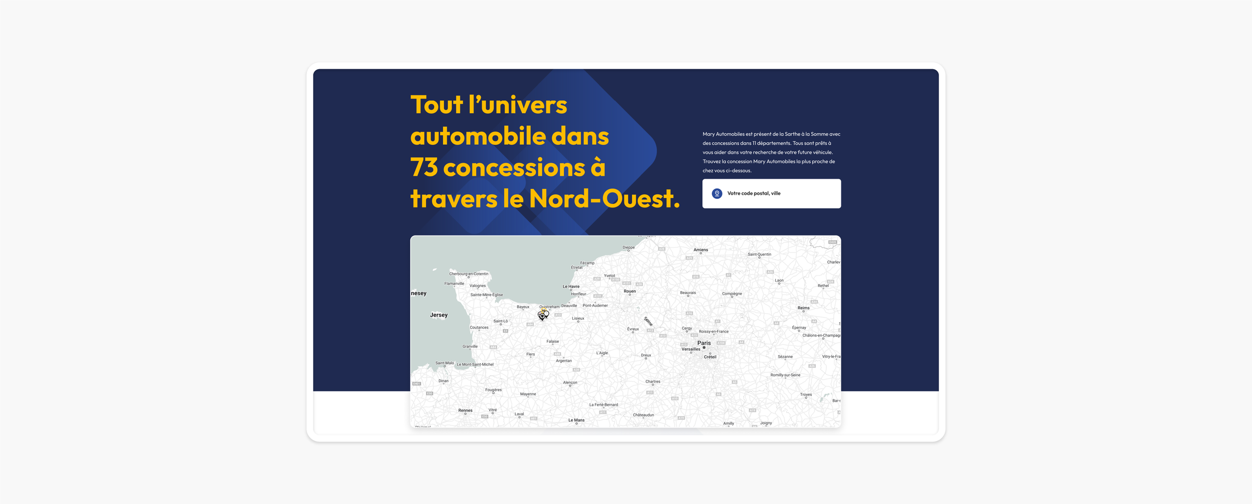 La première tâche a été de mettre à jour le design du site web, en tenant compte du travail antérieur de Matthieu le Solliec pour le groupe Mary. Rapidement, l'accent a été mis sur la facilitation de la navigation pour permettre aux utilisateurs de parcourir les nombreux services après-vente, offres multi-marques, promotions. Le tout étendu sur 12 marques automobiles (aujourd’hui), regroupant un réseau de plus de 70 points de vente qui va de la Normandie jusqu'au Hauts-de-France. Une attention particulière a été portée à la création d'une expérience de navigation fluide et au renforcement de l'image de la marque.